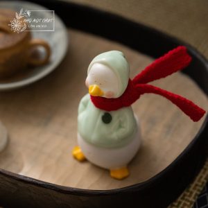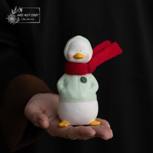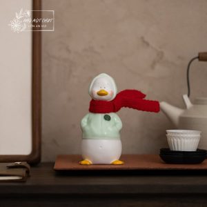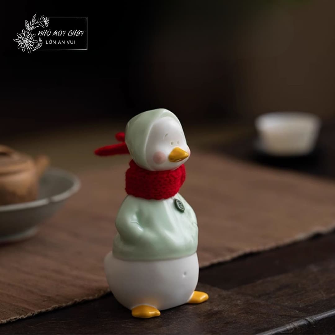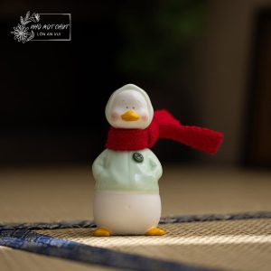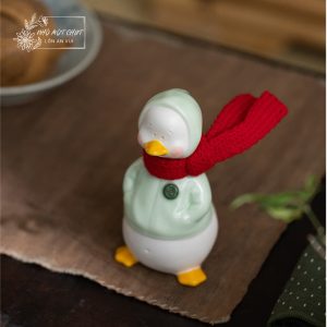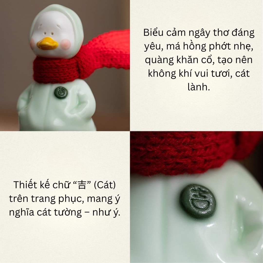 Dáng vịt đứng vững, thân tròn mềm mại, gợi sự no ấm, an cư và hanh thông. Chiếc khăn quàng đỏ nhỏ là điểm nhấn ấm áp, như giữ lại hơi Tết, hơi người, mang theo lời chúc mọi việc trong năm đều thuận buồm, mát tay.