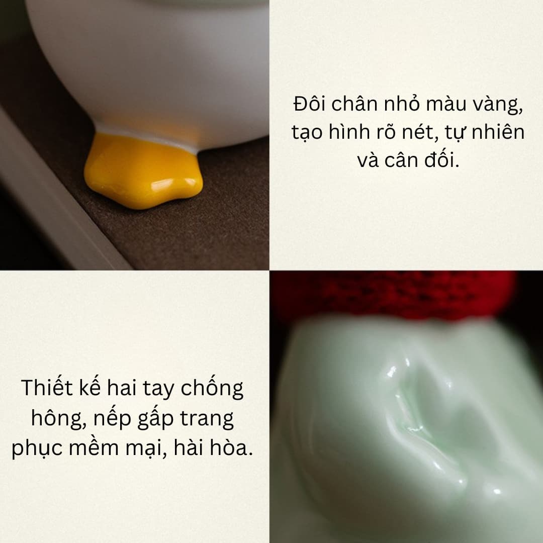 An Cát – chú vịt gốm men ngọc được tạo hình thủ công từ gốm sứ Đức Hóa, nung ở nhiệt độ cao. Lớp men xanh ngọc trong trẻo phủ lên dáng đứng tròn đầy, an nhiên. Khuôn mặt khẽ nghiêng, ánh nhìn hiền lành, An Cát mang cảm giác của sự đủ đầy không phô trương, như một lời chúc bình an được đặt xuống thật nhẹ.