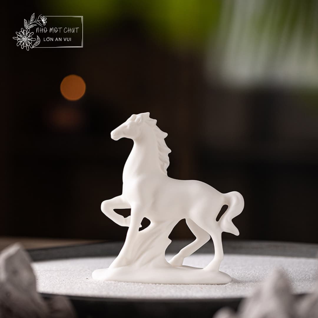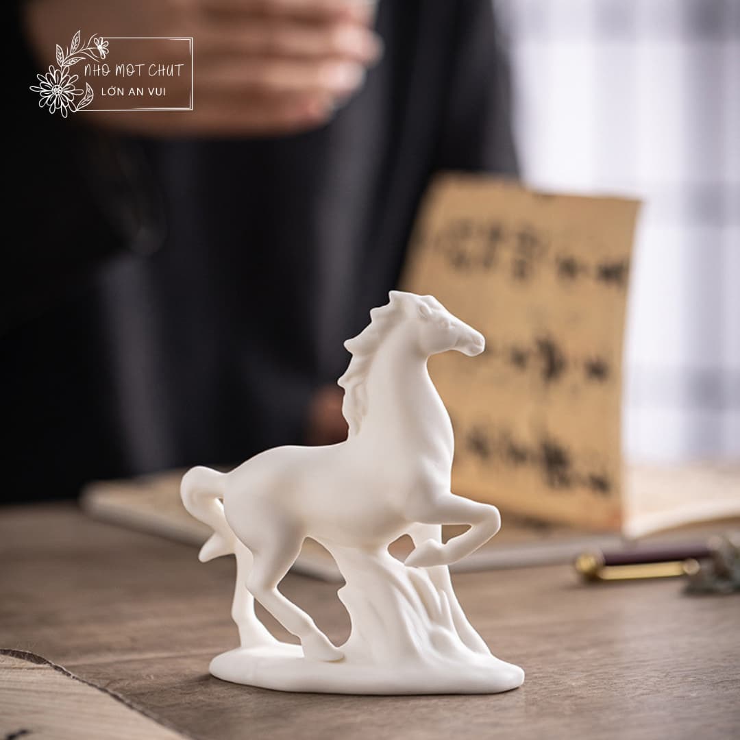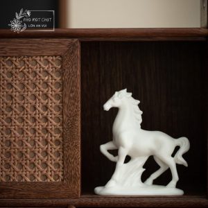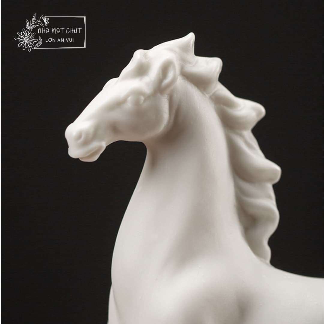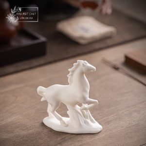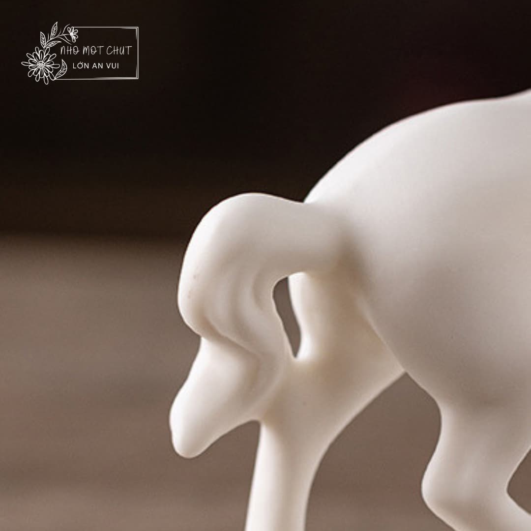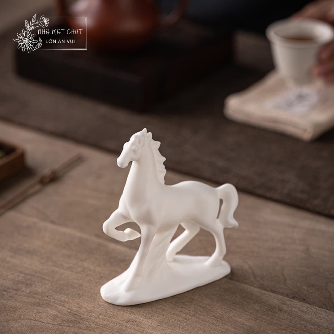 An Khởi – chú ngựa gốm trắng được tạo hình thủ công từ gốm sứ Đức Hóa, nung ở nhiệt độ cao, bề mặt mịn màng và sắc trắng trong tinh khiết. Dáng đứng thanh thoát, đường nét tối giản nhưng dứt khoát, gợi vẻ trầm tĩnh mà mạnh mẽ. Lớp men trắng dịu nhẹ như sương mai, mang theo cảm giác của một ngày mới vừa khẽ mở – nhẹ nhàng, trong trẻo và đầy hy vọng.
