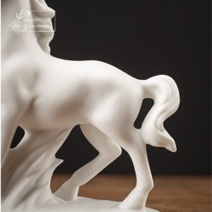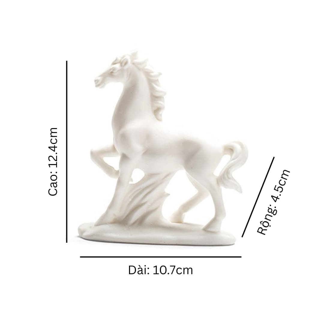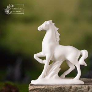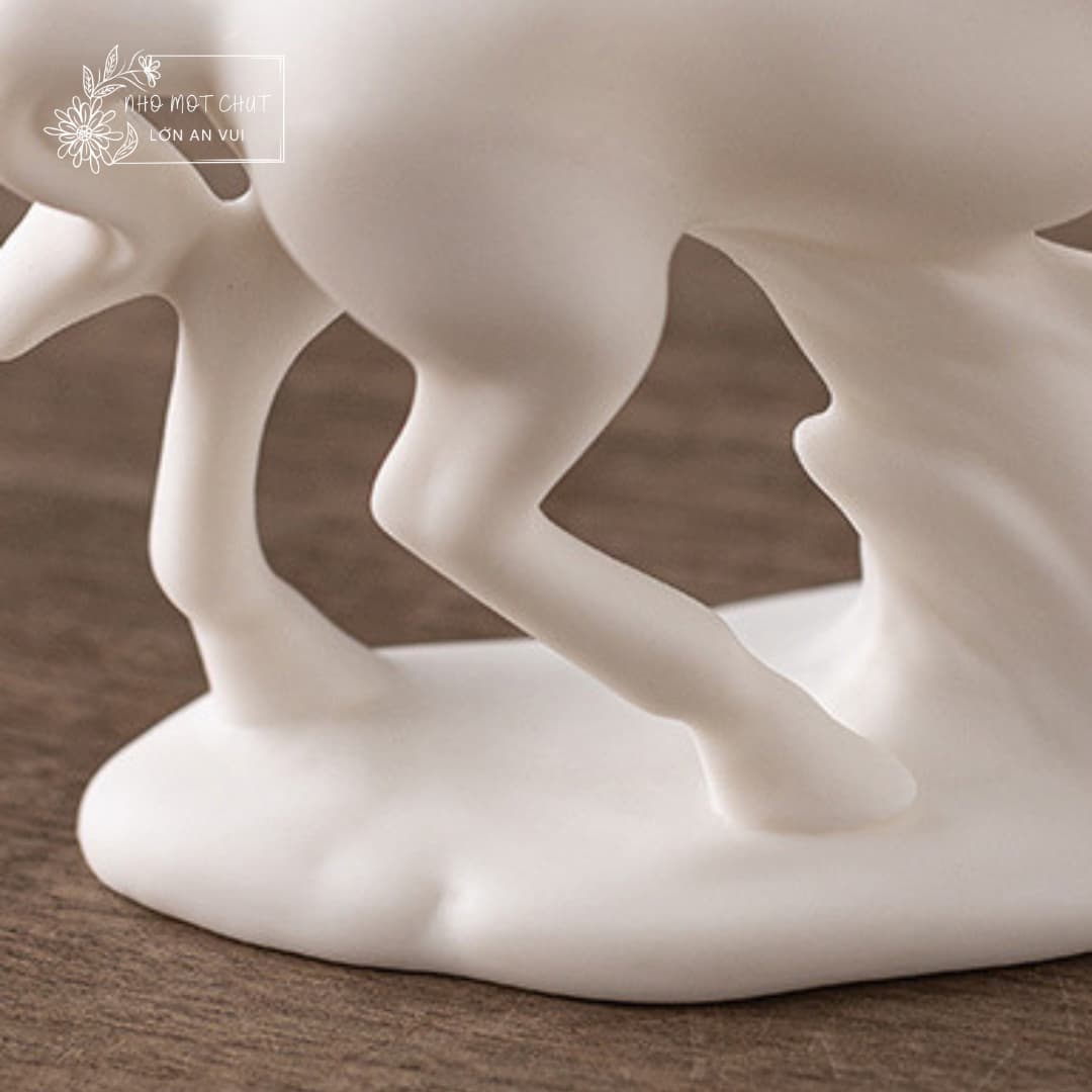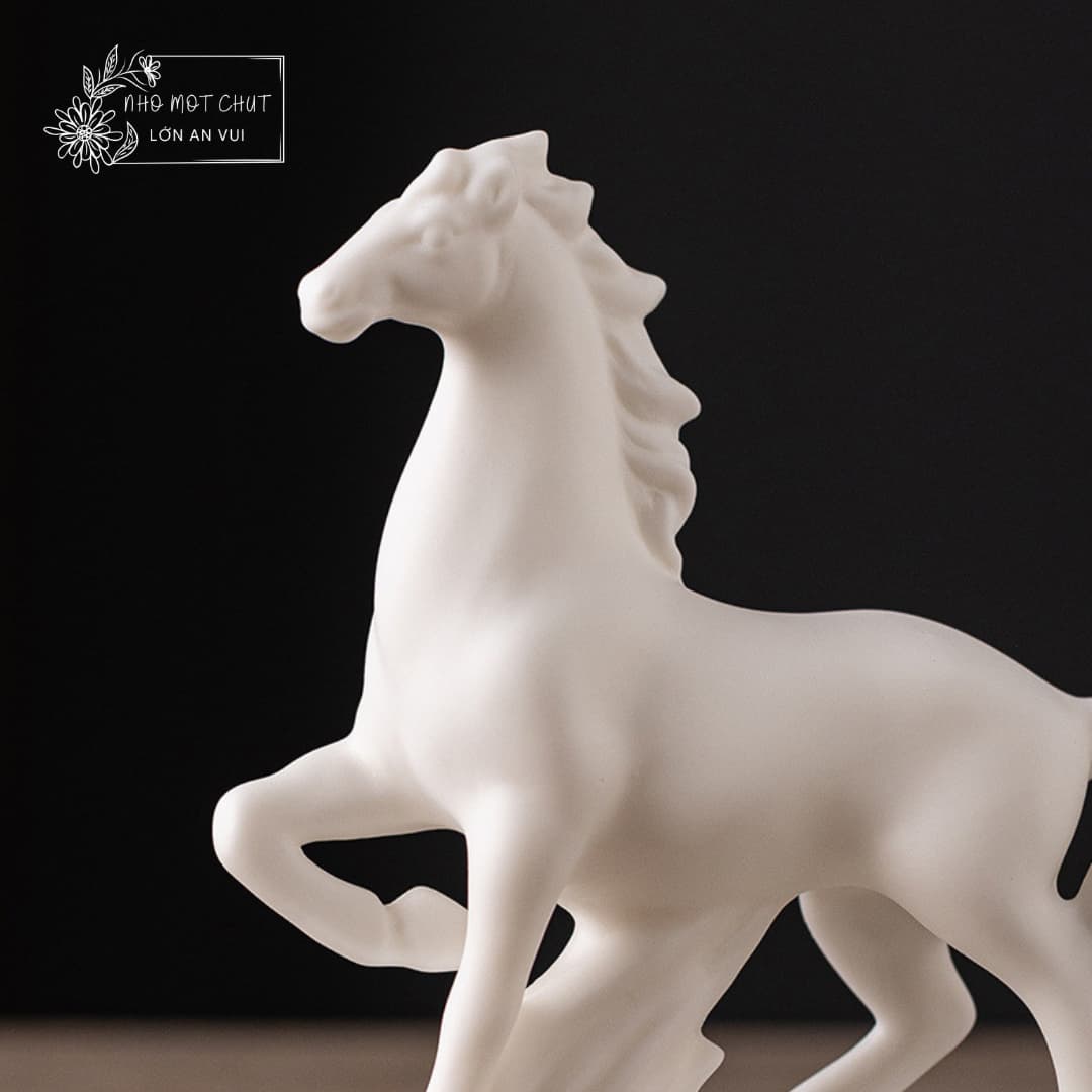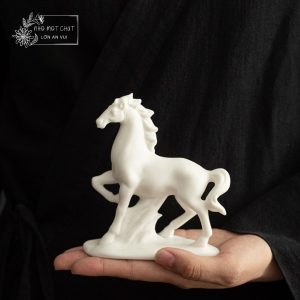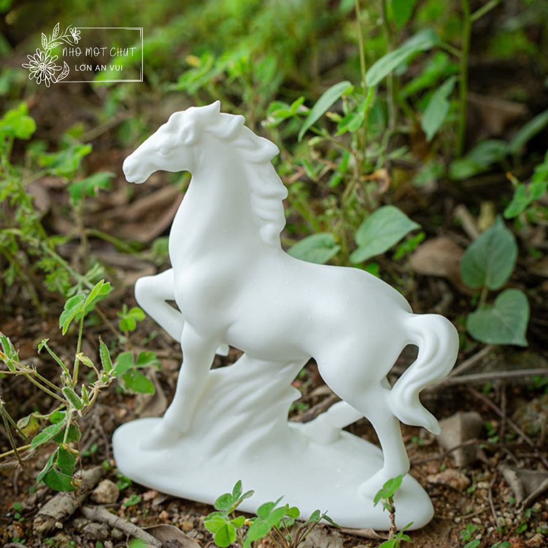 An Khởi – chú ngựa gốm trắng được tạo hình thủ công từ gốm sứ Đức Hóa, nung ở nhiệt độ cao, bề mặt mịn màng và sắc trắng trong tinh khiết. Dáng đứng thanh thoát, đường nét tối giản nhưng dứt khoát, gợi vẻ trầm tĩnh mà mạnh mẽ. Lớp men trắng dịu nhẹ như sương mai, mang theo cảm giác của một ngày mới vừa khẽ mở – nhẹ nhàng, trong trẻo và đầy hy vọng.